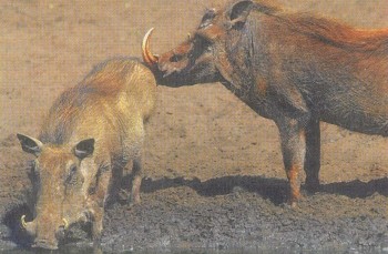 По сравнению с телом у бородавочника очень большая голова. Еще у них очень большие клыки, особенно у самцов (до 60 см). Нижние клыки поменьше, но тоже очень острые. Таким образом, взрослый бородавочник способен постоять за себя, если на него нападает лев, леопард или гиено-вая собака, однако самец никогда не пускает клыки в дело, если речь идет о драке с себе подобным. Встретившись, самцы бородавочника вздыбливают гриву и лбами стараются сдвинуть друг друга с места. Во время такой борьбы они встают на колени, страшно рычат и возбужденно бьют хвостами по бокам.