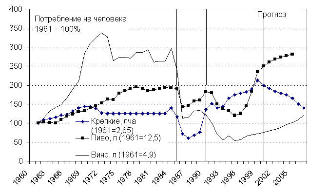 этом потребление пива и вина снижалось. В итоге, к середине 90-х годов
